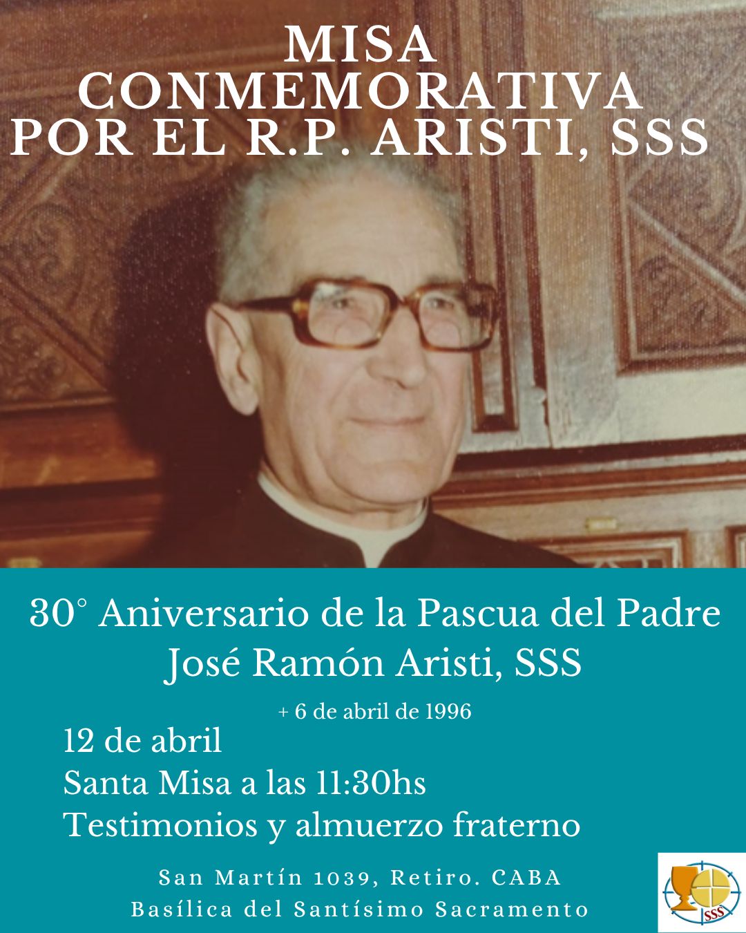 La Misa conmemorativa del Padre José Ramón Aristi, SSS (Sacramentino) se realizará el próximo domingo 12 de abril a las 11:30hs en la Basílica del Santísimo Sacramento del barrio de Retiro en la Ciudad Autónoma de Buenos Aires (San Martín 1039).